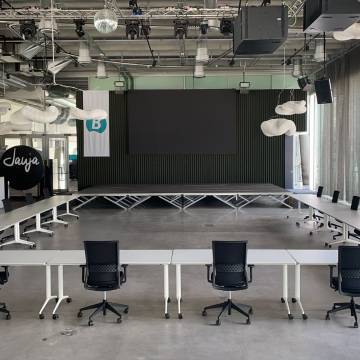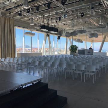 Les instal·lacions compten amb pantalla de led 3x5mtr, equip de so volat model Nexe / Microfonía de mà sense fil / Micròfons de diadema i 24micrófonos de conferència.