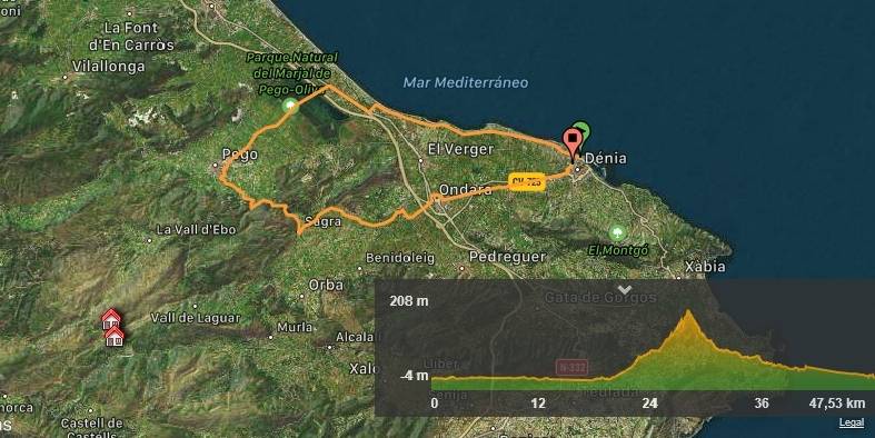Una vez en Pego subiremos Els Pilarets, el único pequeño puerto de esta ruta (CV-715). Tras coronar el puerto, nos dejaremos caer hacia el pueblo de Sagra y desde este punto, regresaremos a Dénia por un tramo “muy rodador” que pasa por localidades como Ráfol d'Almunia, Beniarbeig y Ondara.