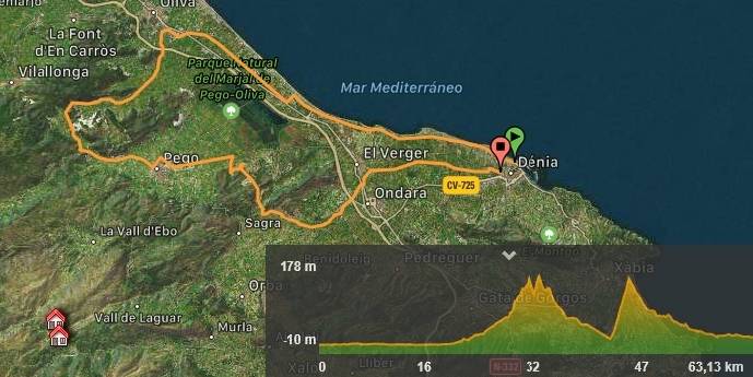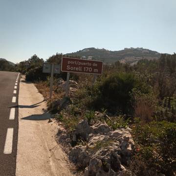 Para volver pasaremos por l'Adsubia y Pego y es entonces donde nos encontraremos con la parte más dura de la ruta, el puerto de Sorell (CV-728). Una vez coronado bajaremos a Ráfol de Almunia y vuelta a Dénia, ya sin ninguna dificultad, por Beniarbeig (CV-729) y otra pequeña carretera secundaria.