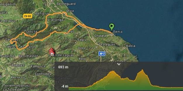 La vuelta la haremos por el municipio de Lorcha (CV-701) y La Llacuna. Este tramo es bastante exigente con largas rampas de mucha pendiente pero luego ya solo queda disfrutar de un bonito descenso hasta Villalonga y llanear hasta Oliva para luego dirigirse a Dénia.