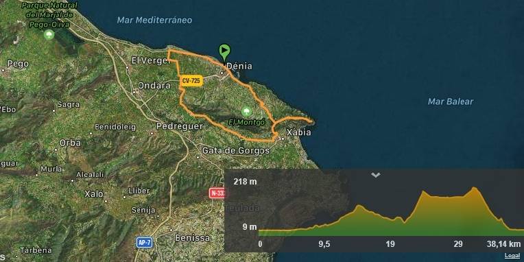 Ruta en la que se rodea el Parque Natural del Montgó por la carretera de Jesús Pobre (CV-735). Se trata de una ruta corta aunque debe tenerse en cuenta que al llegar a la localidad de Jávea (Xàbia) nos encontraremos con un puerto de bastante pendiente de ascensión al cabo de San Antonio (CV-736).